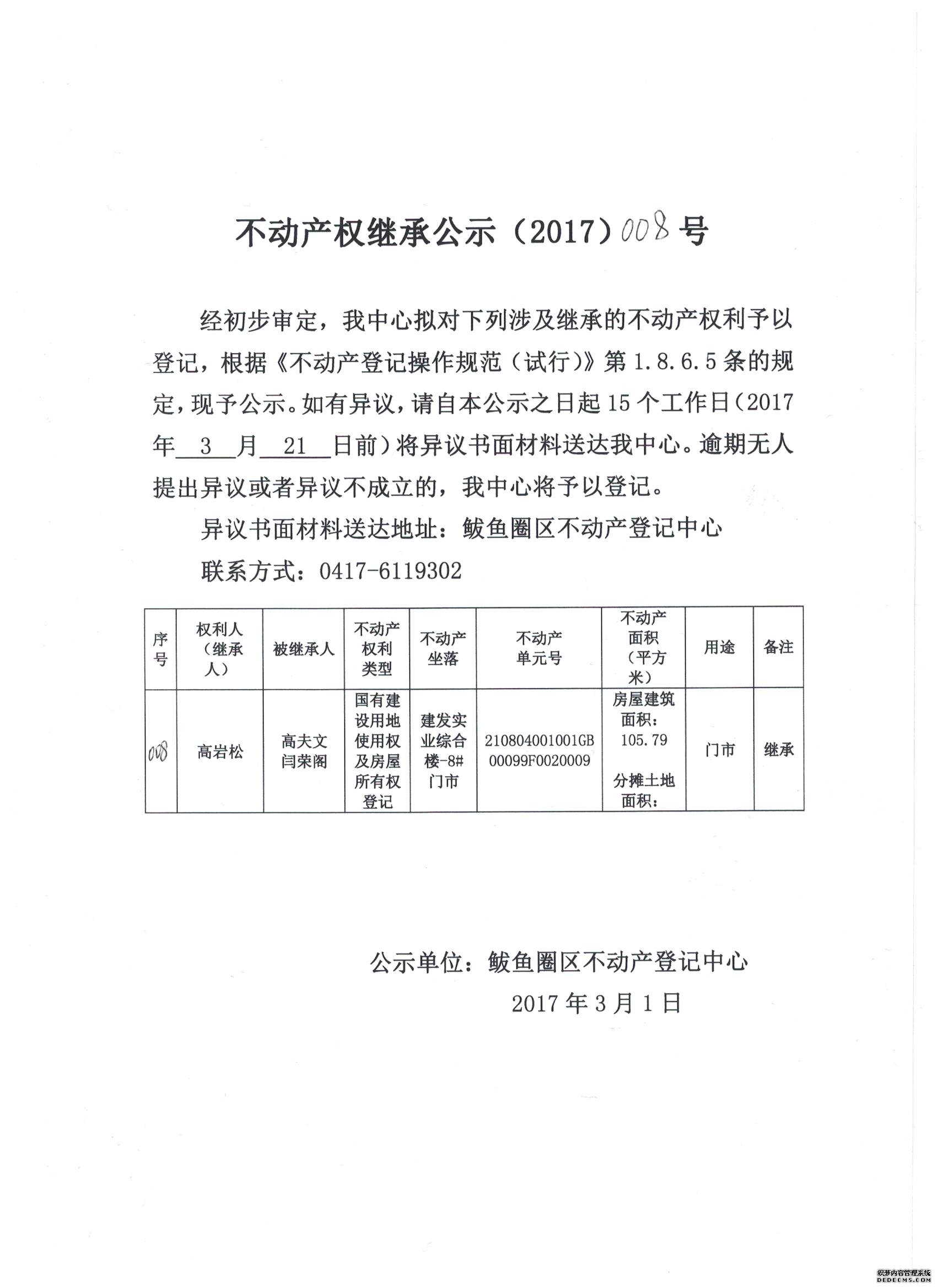 不动产权继承公示(2017)008号
