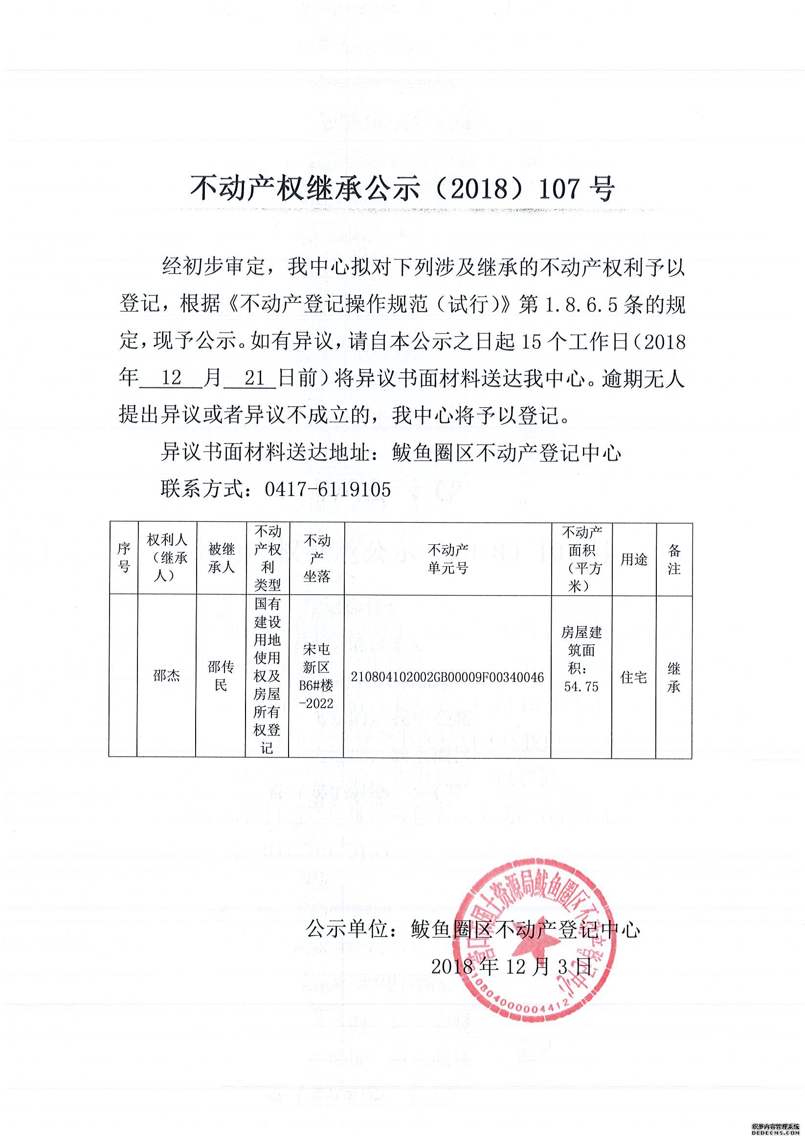 不动产权继承公示(2018)107号