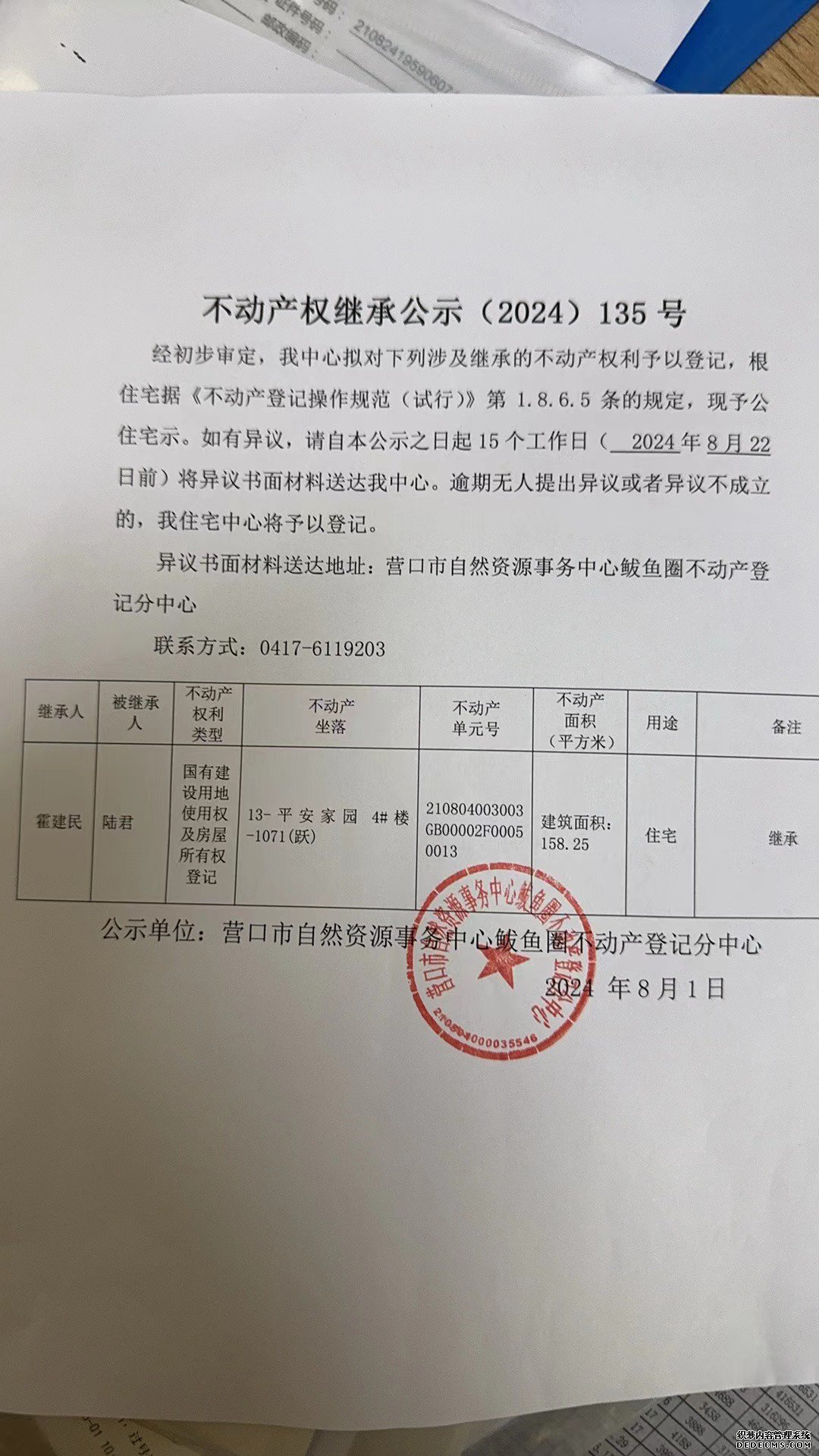 不动产权继承公示(2024)135号