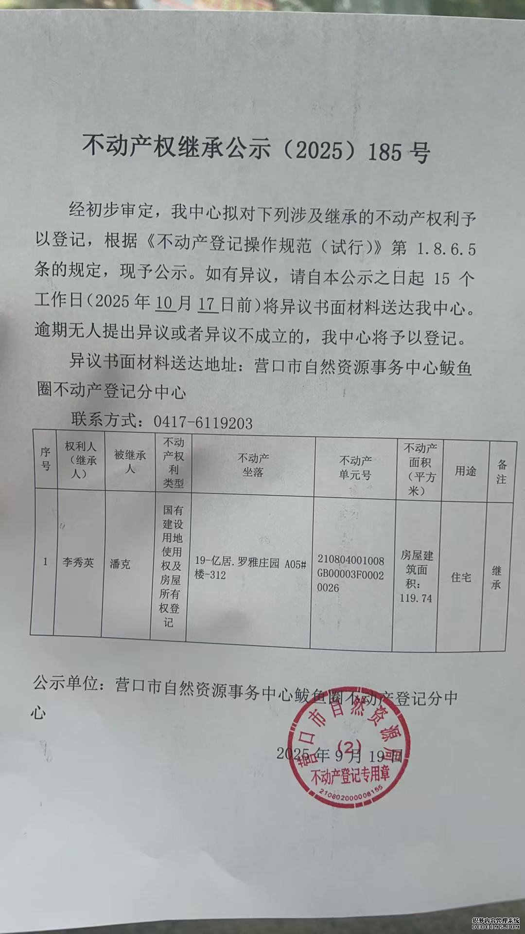 不动产权继承公示(2025)185号