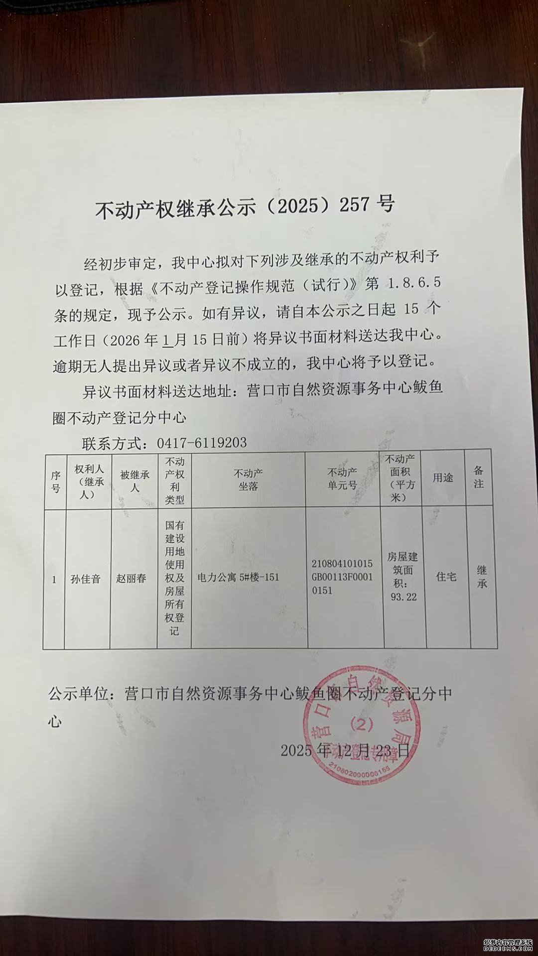 不动产权继承公示(2025)257号